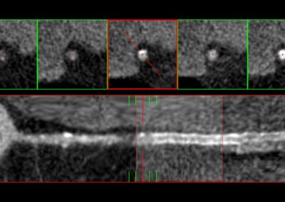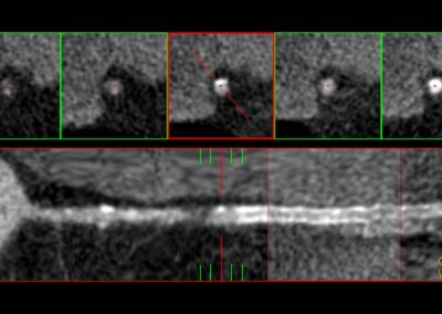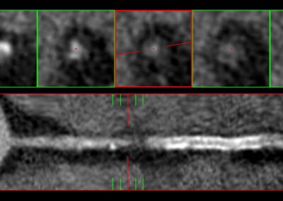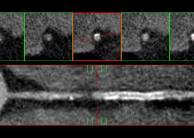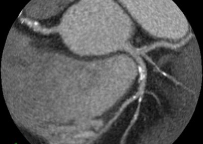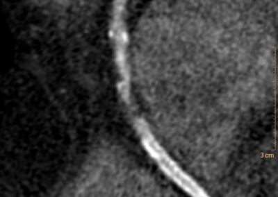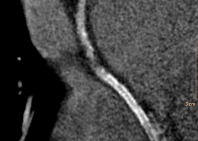 Τρισδιάστατη και δισδιάστατη απεικόνιση των στεφανιαίων αγγείων όπου διακρίνεται σημαντικότατη στένωση της δεξιάς στεφανιαίας αρτηρίας λίγο πριν το προϋπάρχον stent, το οποίο απεικονίζεται φυσιολογικά βατό